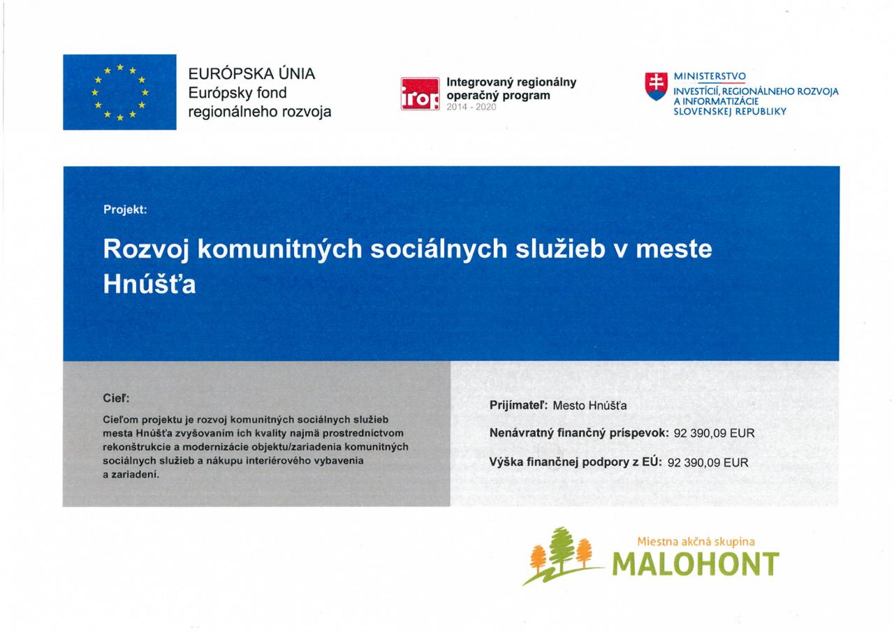 Uvedenú rekonštrukciu plánuje mesto realizovať prostredníctvom predloženej žiadosti na získanie príspevku IROP pre projekt s názvom Rozvoj komunitných sociálnych služieb mesta Hnúšťa, ktorý predložilo miestnej akčnej skupine MAS MALOHONT vo výške 92.390,09 €. Cieľom projektu je rozvoj komunitných sociálnych služieb mesta Hnúšťa zvyšovaním ich kvality najmä prostredníctvom rekonštrukcie a modernizácie budovy a nákupu interiérového vybavenia a zariadení.