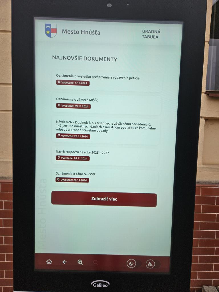 Interaktívna úradná tabuľa je inštalovaná pred mestským úradom s potenciálom veľkej využiteľnosti. Mnohým občanom uľahčí hľadanie príslušných informácií a to doslova priamo na mieste.