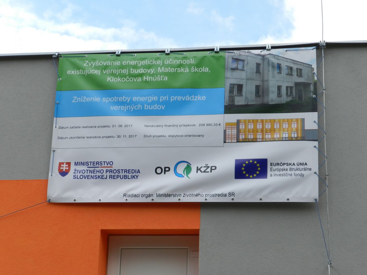 Budova Materskej školy Klokočova bola postavená v 80-tich rokoch minulého storočia. Od tej doby neprešla výraznejšou obnovou a podpísal sa na nej aj zub času. V minulom roku mesto požiadalo v rámci výzvy vyhlásenej Ministerstvom životného prostredia prostredníctvom Operačného programu Kvalita životného prostredia zameranej na energetickú efektívnosť administratívnych budov o nenávratný finančný príspevok na jej obnovu a aj napriek obrovskému pretlaku žiadostí sa podarilo našu žiadosť schváliť.