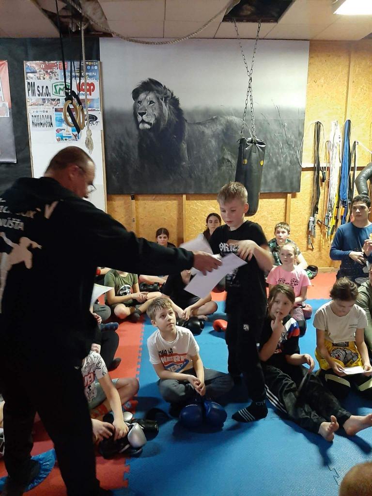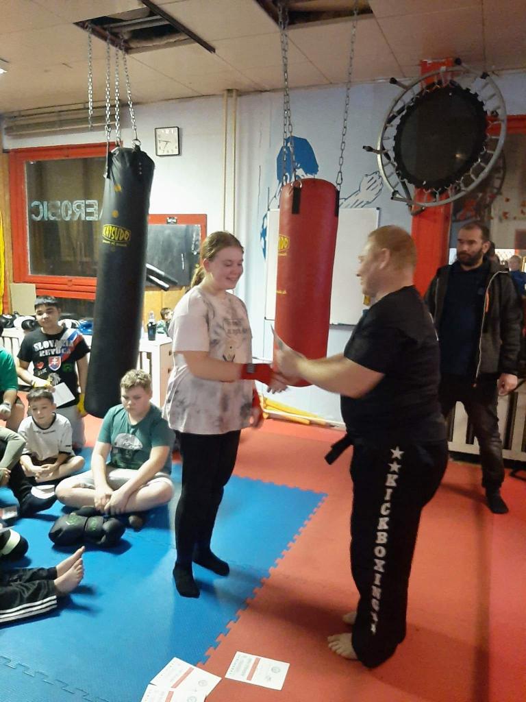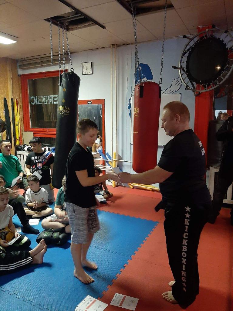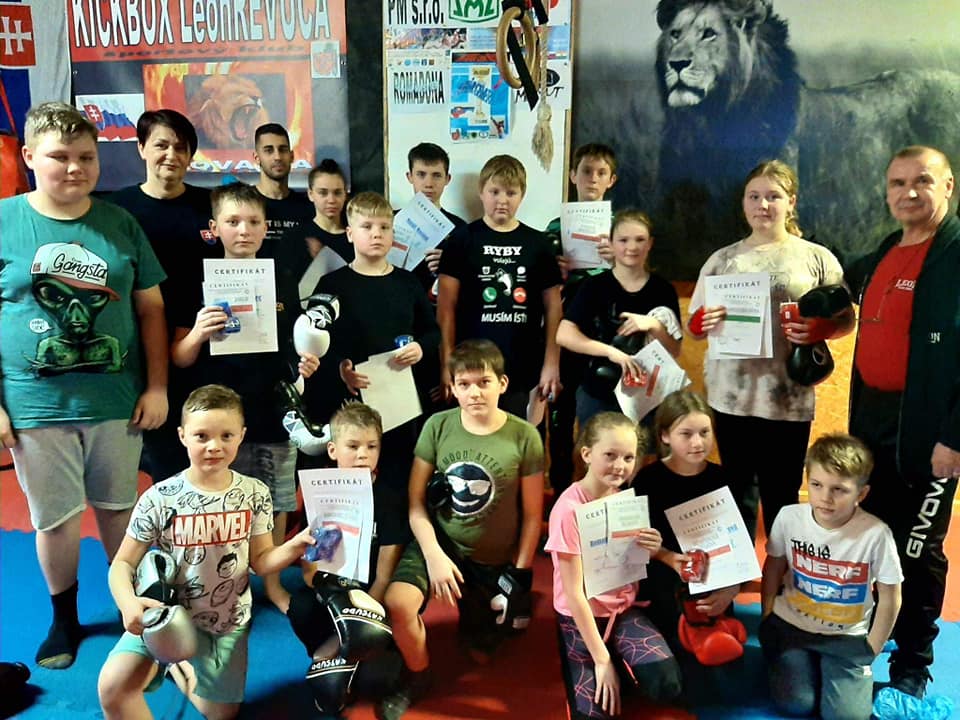 Nakoniec všetkých 16 našich cvičencov spravilo skúšky technickej vyspelosti, o čom dostali aj certifikát a od klubu ako pamiatku na páskovanie bandáže na ruky. Dosiahli prevažne červené pásy, t.j. 5.kyu, jedna členka Kick-Box Leon Hnúšťa spáskovala na 4.kyu. Všetkým srdečne gratulujeme a ďakujeme hlavne rodičom za pomoc a podporu svojich detí pri tejto peknej akcii.