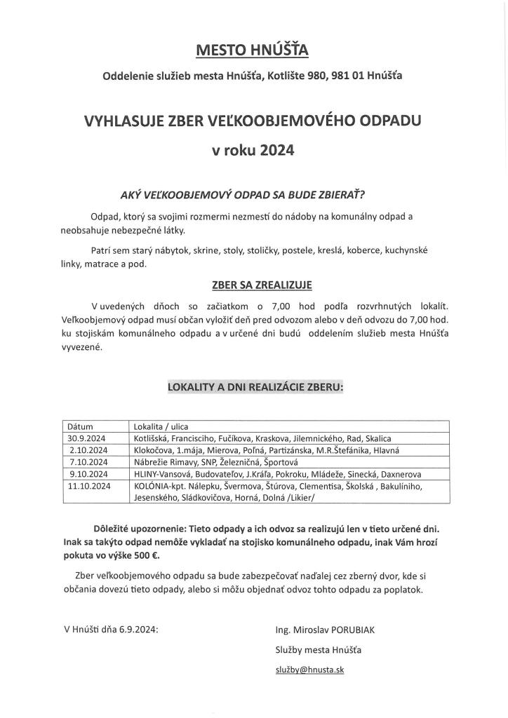 ZBER VEĽKOOBJEMOVÉHO ODPADU - JESEŇ 2024