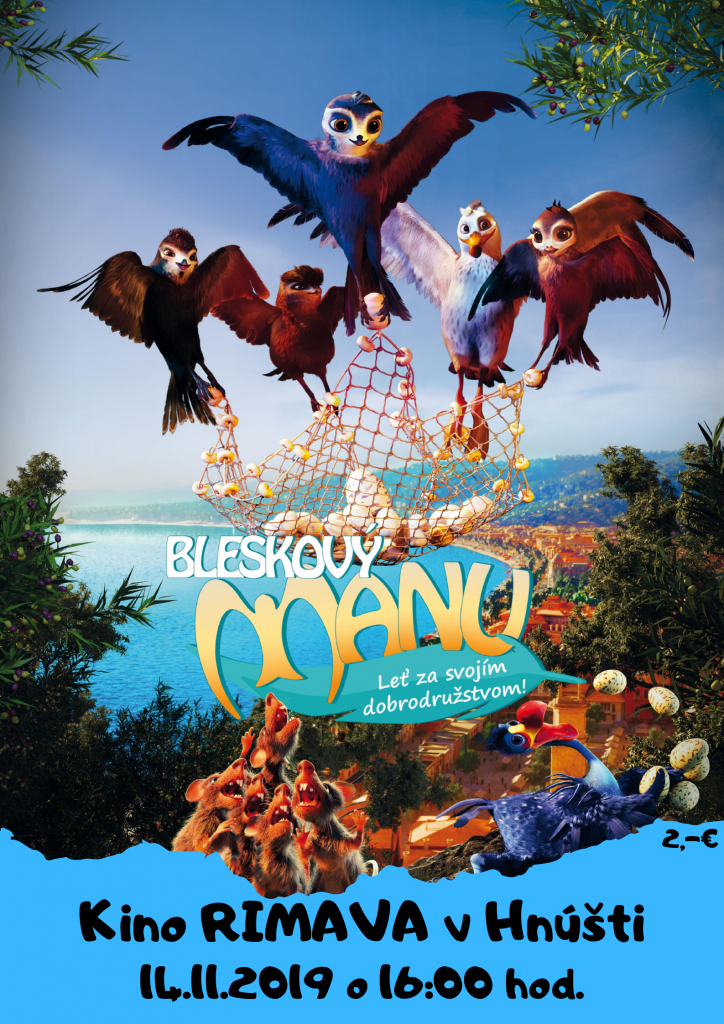 Kino Rimava Hnúšťa Vás pozýva na krásnu animovanú rozprávku. Leť za svojím dobrodružstvom! V oblakoch, vo vzduchu, nad morom, nad lesom, nad prímorským mestečkom i v jeho uliciach sa odohráva vtáčie animované dobrodružstvo Bleskového Manua.
