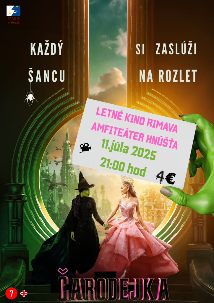 Letné Kino Rimava vás pozýva na jeden z najslávnejších muzikálov súčasnosti s Arianou Grande v hlavnej úlohe Čarodejka. Vychutnajte si nesmrteľný príbeh dvoch kamarátok s magickými schopnosťami pod holým nebom na amfiteátri v Hnúšti tento piatok 11.júla o 21,00 hodine. Vstupné 4€.