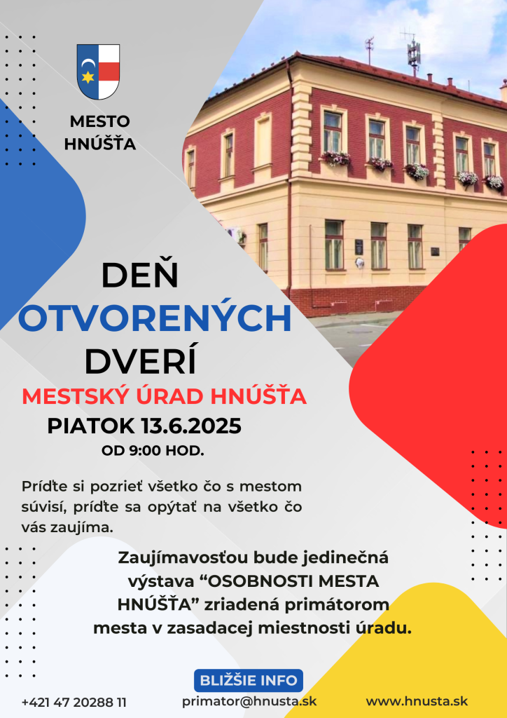 Mesto Hnúšťa srdečne pozýva všetkých obyvateľov a návštevníkov na Deň otvorených dverí, ktorý sa uskutoční v piatok 13. júna 2025 od 9:00 hod. v priestoroch Mestského úradu Hnúšťa.