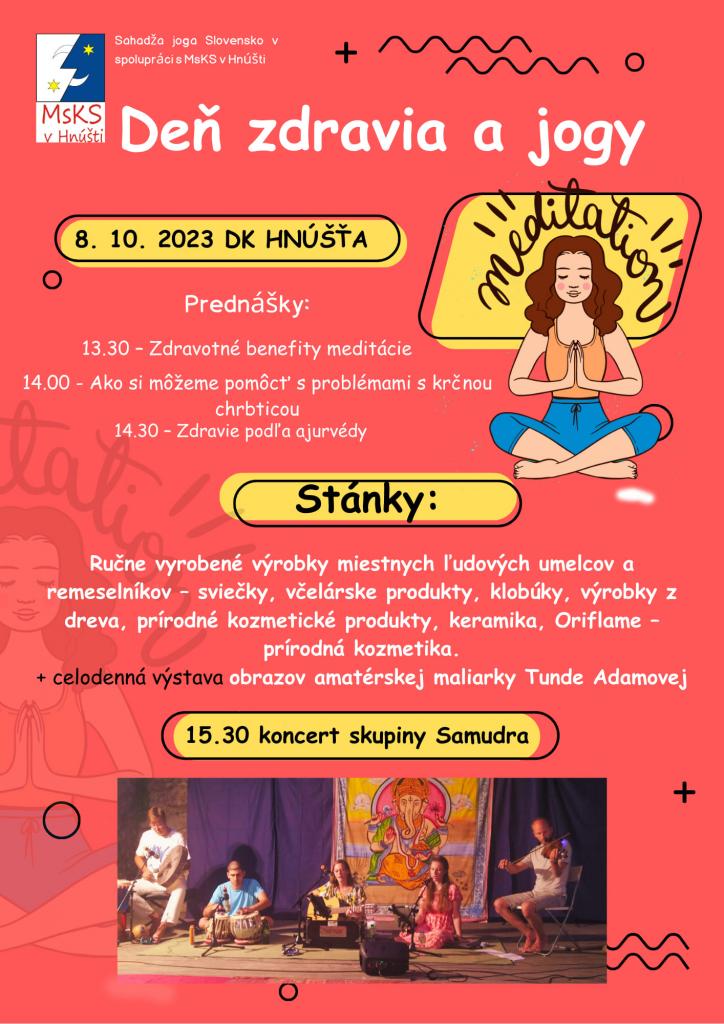 Sahadža joga v spolupráci s MsKS vás srdečne pozývajú na Deň zdravia a jogy už túto nedeľu 8.10.2023 od 13:30 do prístavby Domu kultúry v Hnúšti kde na vás čakajú zaujímavé prednášky, stánky, výstava obrazov či koncert skupiny Samudra.