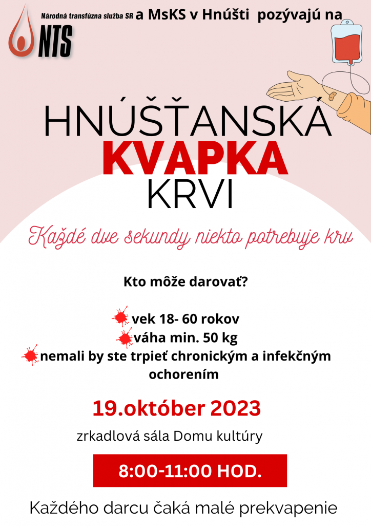 Tvoja malá obeť môže znamenať obrovský rozdiel. Je to dar nádeje a lásky, ktorý nesie silný odkaz: "Som tu pre teba. Som tu, aby som zachránil život." Každá kvapka krvi, ktorú daruješ, má potenciál zachrániť život niekoho iného. Zachráň život a príď darovať krv 19.10.2023 v Dome kultúry v Hnúšti.