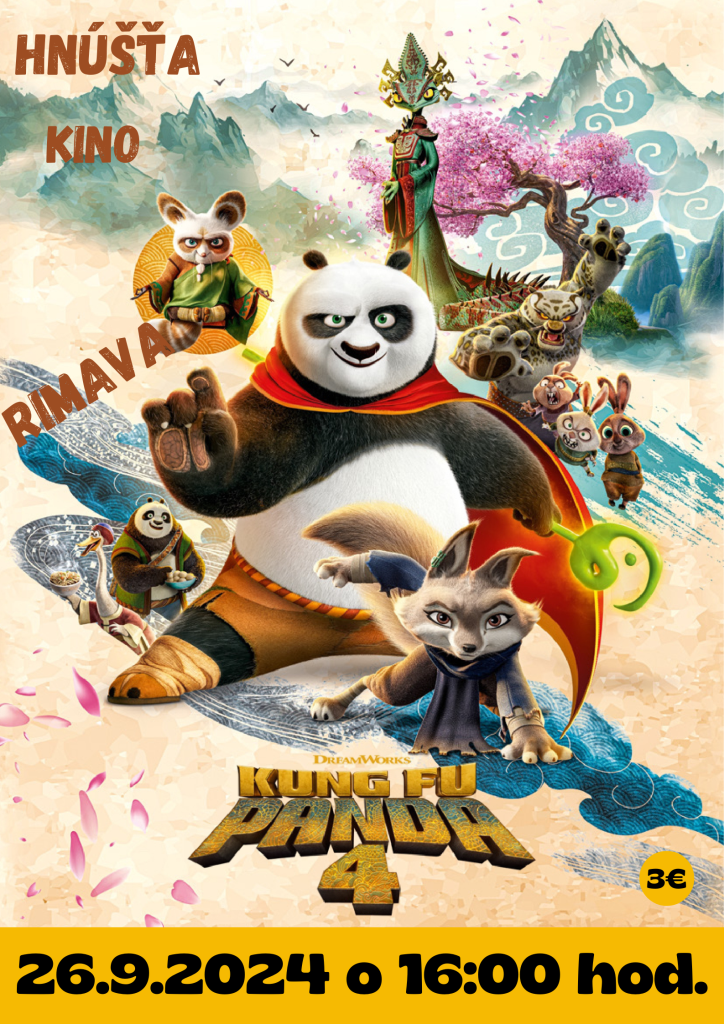 Kino Rimava vás srdečne pozýva na animovanú rozprávku Kung-Fu Panda 4 vo štvrtok 26.9. 2024 o 16:00 tej hodine. Vstupné: 3€