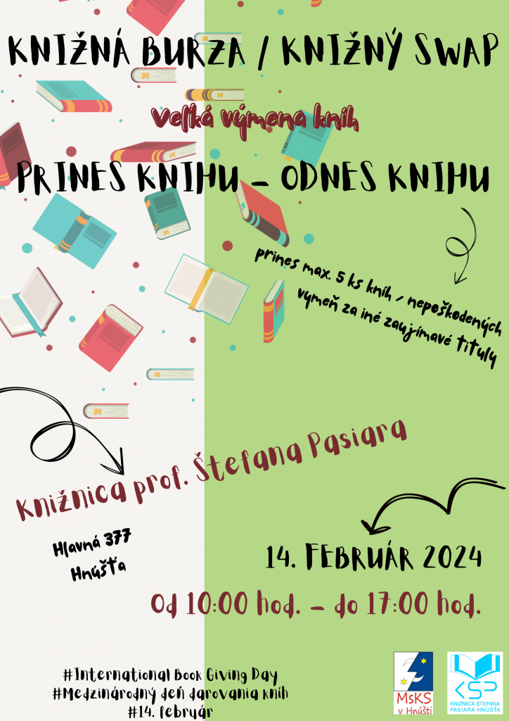 Knižná burza sa koná pri príležitosti "Medzinárodného dňa darovania kníh" - 14. februára 2024, od 10:00 hod. do 17:00 hod.
