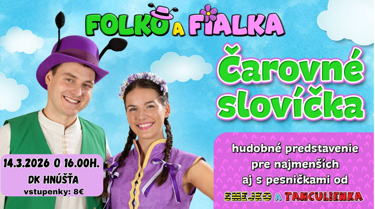 Ahojte chrobáčikovia, sme nová spievajúca dvojica Folko a Fialka! Mravček Folko, ktorý rád tancuje a víla Fialka, ktorá rada spieva. Prichádzame k vám s naším prvým predstavením, ktoré sa volá Čarovné slovíčka.