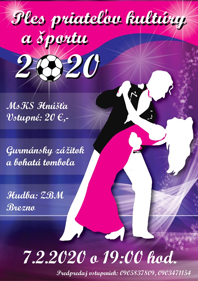 Srdečne Vás pozývame na Ples priateľov kultúry a športu, ktorý sa uskutoční 7.2.2020 o 19:00 hod. v spoločenskej sále MsKS Hnúšťa.