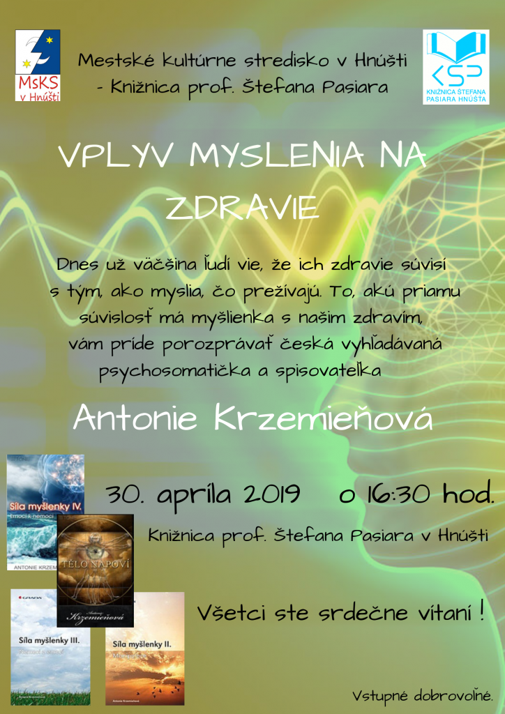 Srdečne všetkých pozývame na ďalšiu zaujímavú prednášku - VPLYV MYSLENIA NA ZDRAVIE- 30.apríla 2019 o 16:30 hod. v Knižnici prof. Š. Pasiara Hnúšťa.