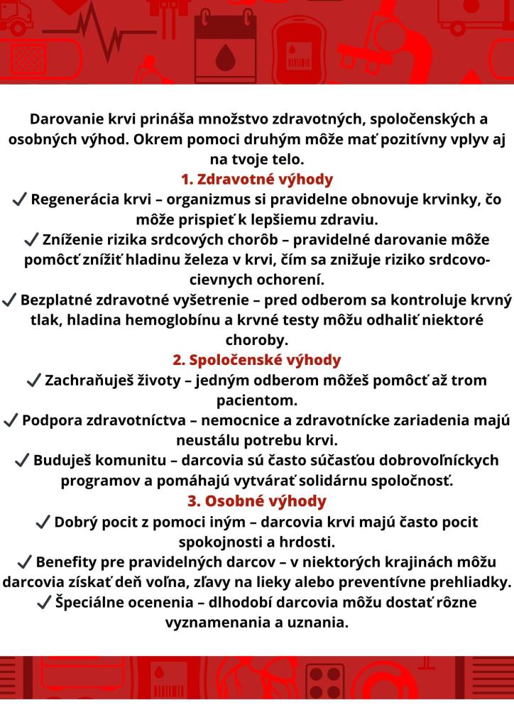 Darovanie krvi je jeden z najhumánnejších krokov, ktorý môžeš urobiť na pomoc iným. Krv je vždy potrebná a tvoja pomoc môže naozaj zachrániť život. Každá kvapka krvi, ktorú daruješ, je príspevkom k väčšiemu dobru. Spojením síl s ostatnými darcami vytvárame silnú komunitu, ktorá podporuje zdravie a životy iných.