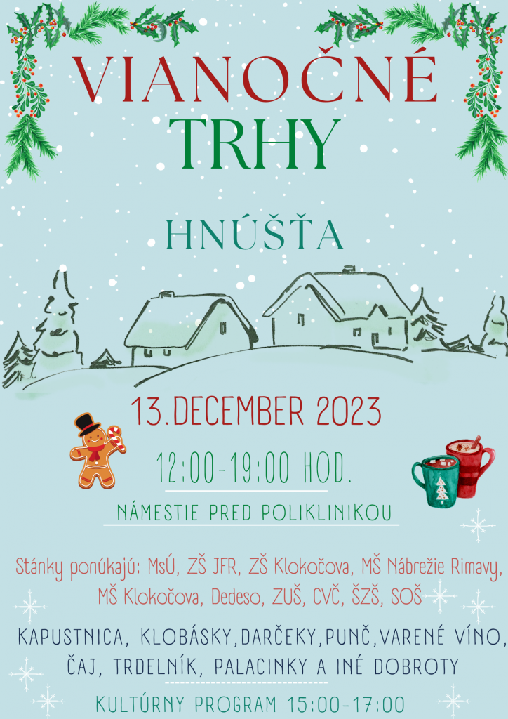 Námestie pred poliklinikou sa zmení na vianočnú uličku, ktorou sa budú šíriť vône pečených klobások, kapustnice, palaciniek, zemiakových placiek, trdelníkov, štrúdle, držiek, hot-dogu, pukancov, čaju, vareného vínka, punču obohatené o kultúrny program detí z materských škôl, žiakov základných škôl, špeciálnej základnej školy, základnej umeleckej školy, seniorov mesta a ženskej speváckej skupiny Skaliny.