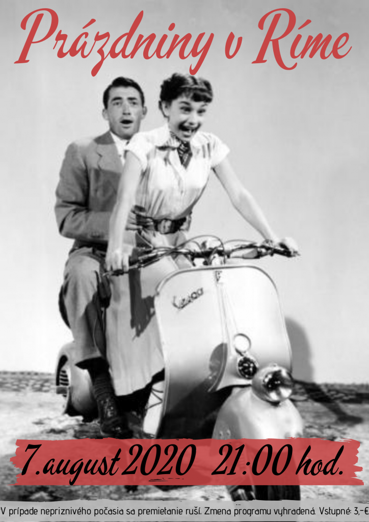 Letné kino Rimava v Hnúšti vás pozýva na kultový film Prázdniny v Ríme. Ide o romantickú komédiu z roku 1953 s famóznou Audrey Hepburn a Gregorym Peckom, nominovanú na 10 Oskarov, ktorú ocenia nielen filmoví pamätníci, ale verím, že filmu dajú šancu aj mladší. Argumentom ísť na tento film je aj hodnotenie na Československej filmovej databáze s vysokým číslom 88%.