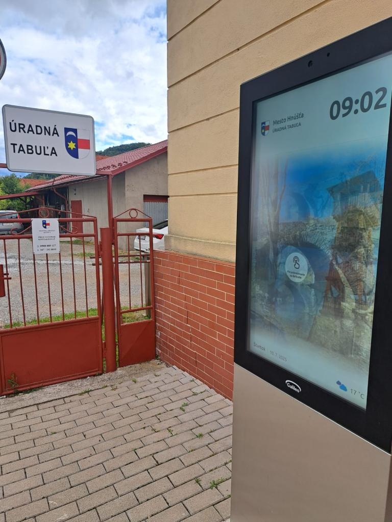 Mesto Hnúšťa sa rozhodlo odstrániť staré vývesky určené na zverejňovanie informácií v papierovej forme a osadilo novú, modernú elektronickú úradnú tabuľu, kde je možné jednoduchým spôsobom si nájsť akékoľvek správy a údaje určené pre obyvateľov mesta i jeho návštevníkov. Je prispôsobená aj pre občanov s rôznym zdravotným postihnutím. Nájdete ju pri vchode do mestského úradu.